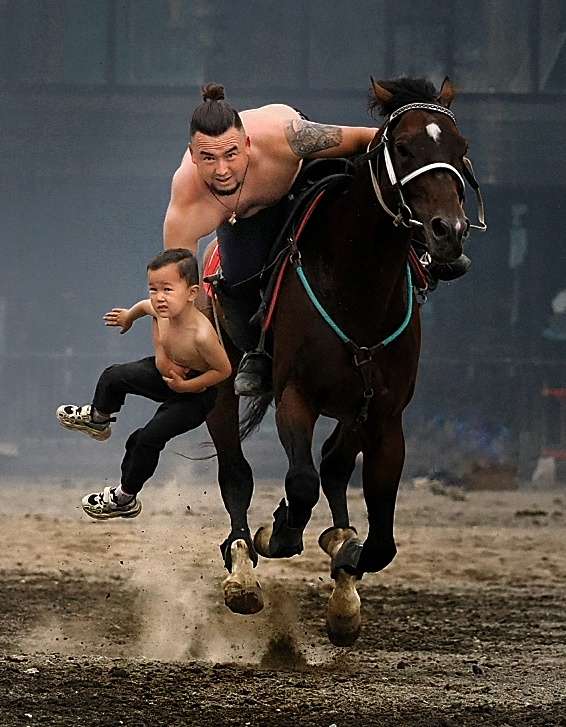 6 月 23 日,新疆汗血宝马基地。镜头捕捉到一场扣人心弦的马术表演:骑手与三岁孩童,在疾驰的马背上展开惊险互动。骑手以精湛技巧掌控力量,与马匹完美配合;孩童则展现出超乎年龄的勇气,与马匹亲近、嬉戏。一刹那,力量与勇气交织,默契在飞驰中传递,不仅彰显马术运动的极致魅力,更定格下传统马术特技里亲子携手挑战、共同传承技艺的珍贵与张力满满的精彩画面。(钱捍摄)